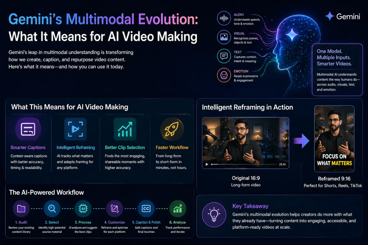 For content developers, the most exciting part is when multimodal understanding and video repurposing come together. When AI can really grasp video information in all its dimensions, it becomes much smarter at repurposing.